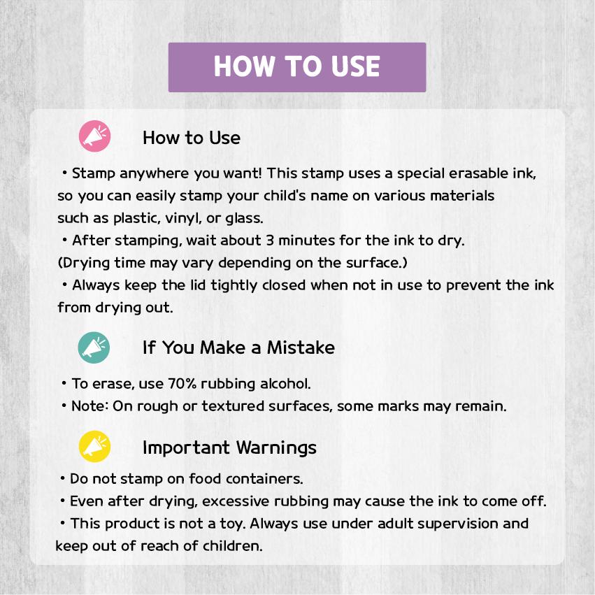 • Fast & Simple Labeling – The easiest way to mark children’s belongings with their names. Just press and stamp.